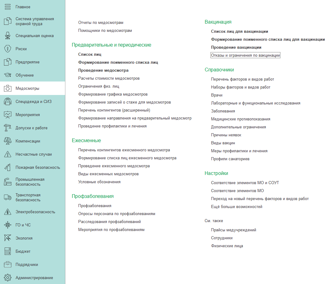 «Охрана труда» это программа для отражения результатов и планирования медосмотров. Для автоматизации проведения медосмотров работников в программе используется подсистема «Медицинские осмотры».